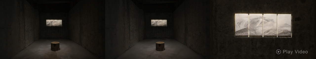 Season Laoのインスタレーションは、空間そのものを静かに変容させる。雪景色を背後に抱えた展示空間の内部で、鑑賞者は床に座り、作品と同じ高さに身を置く。そのとき、作品は単なる視覚対象ではなく、身体を包み込む環境へと転化する。